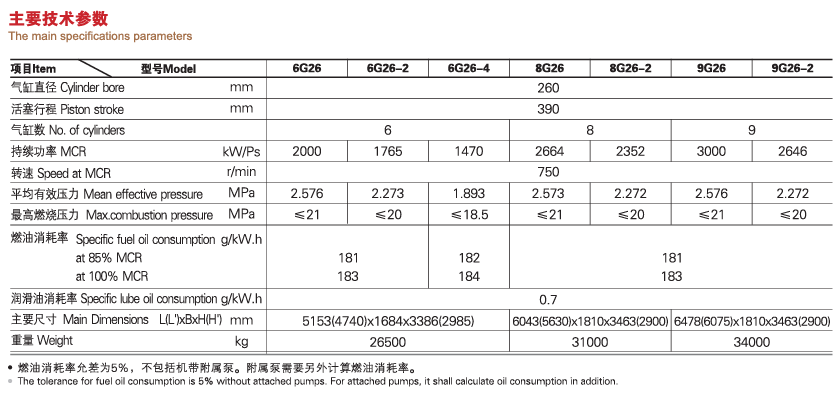 G26系列柴油机是我公司自主研发的新一代产品,是在我公司长期积累的大量设计、计算、试验数据和丰富的制造经验基础上,吸取国际先进技术开发成功的。可燃用380厘海/50龙的重油,曲轴采用全平衡结构整机振动小,柴油机自由端可以输出100%的额定功率。