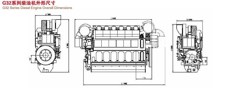 G32型船用柴油机为四冲程、水冷、直接喷射、废气涡轮增压、中间空气冷却、不可逆转的柴油机。有6缸、晌 、9缸 ,功率2665-4400kW等规格,可燃用运动粘度380厘海/50°C或雷氏1号