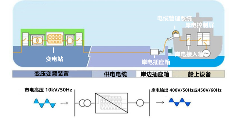 岸基装置:安装在码头或港口,用于向船舶提供岸电的设备,一般包括高压配电柜,变压器、变频器(适用时)和码头岸电插座箱。