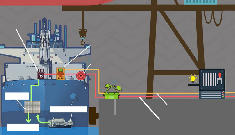 船载装置:安装在船舶上用于连接岸电的设备,一般包括插头/插座、岸电连接配电柜(板)、变压器、岸电接入控制屏、岸电电缆和电缆管理系统。