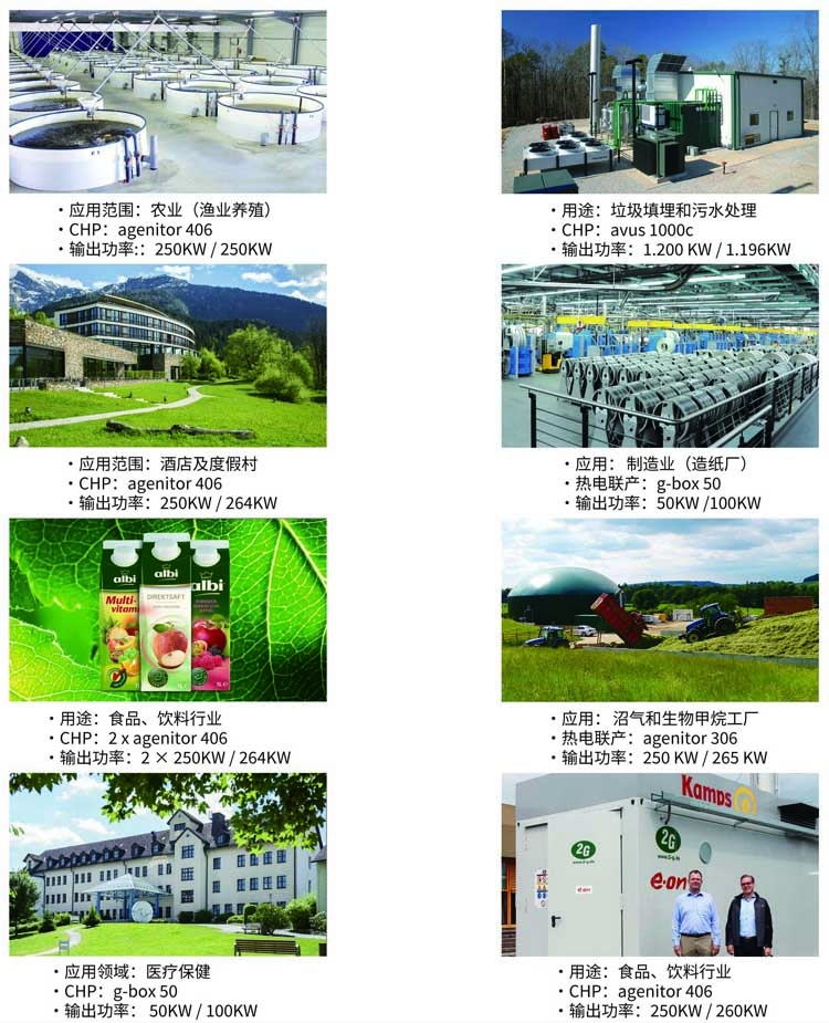 应用领域:农业、机场、啤酒厂、食品工业、温室、杂货店、医院和护理设施、垃圾填埋场、工业与制造业、制药设施、酒店及度假村、大学、废水处理厂、微电网热电联产、可再生天然气设施等。